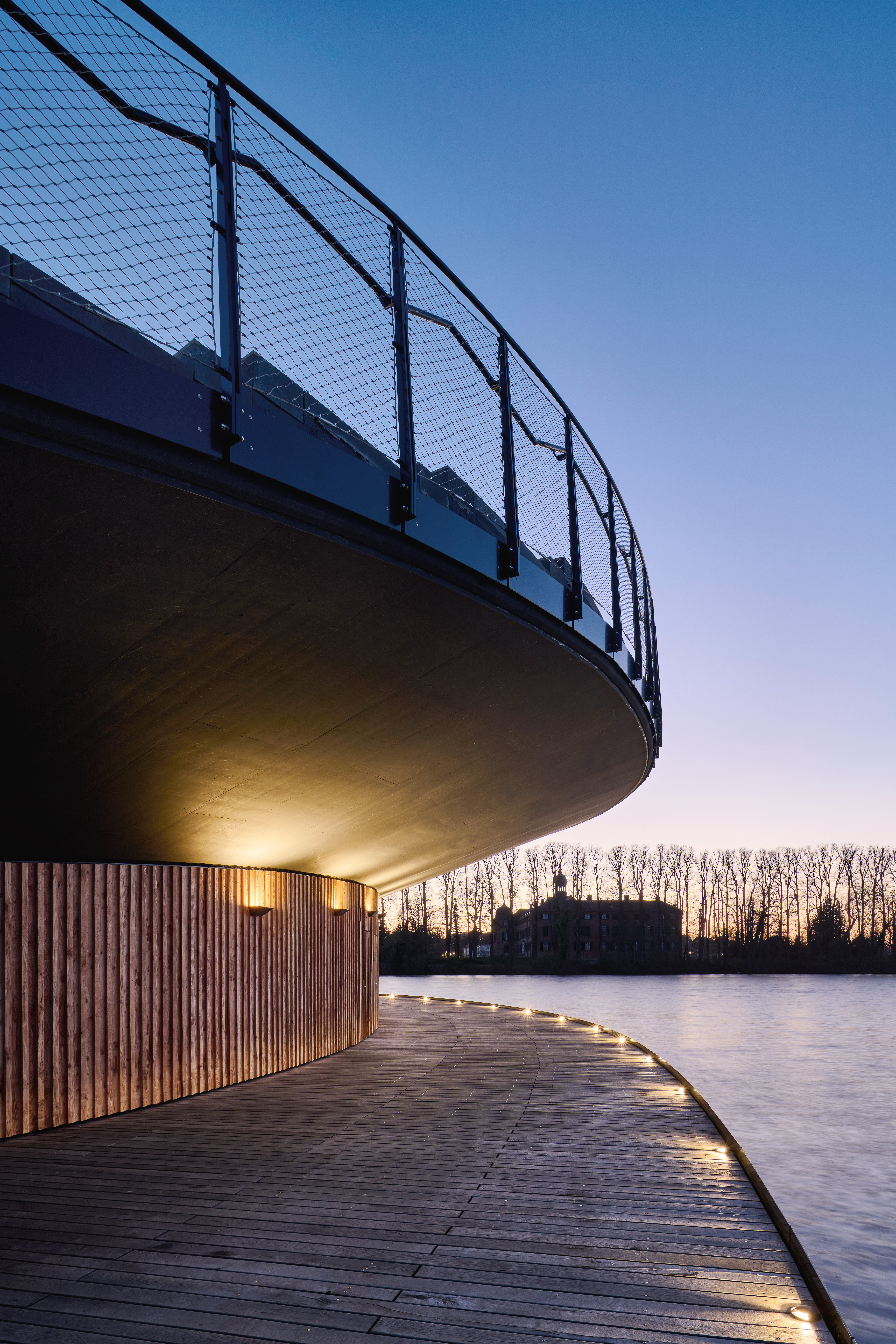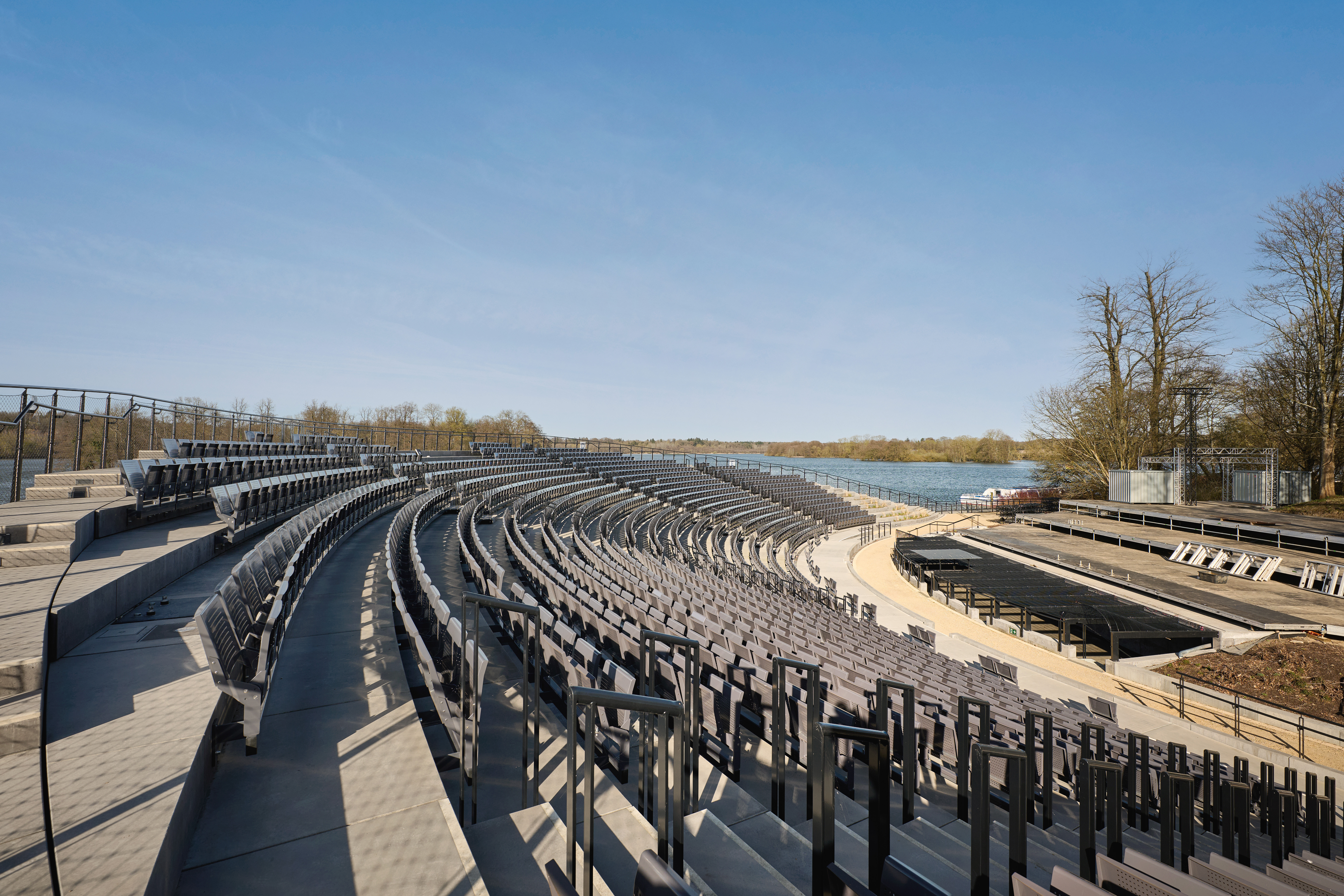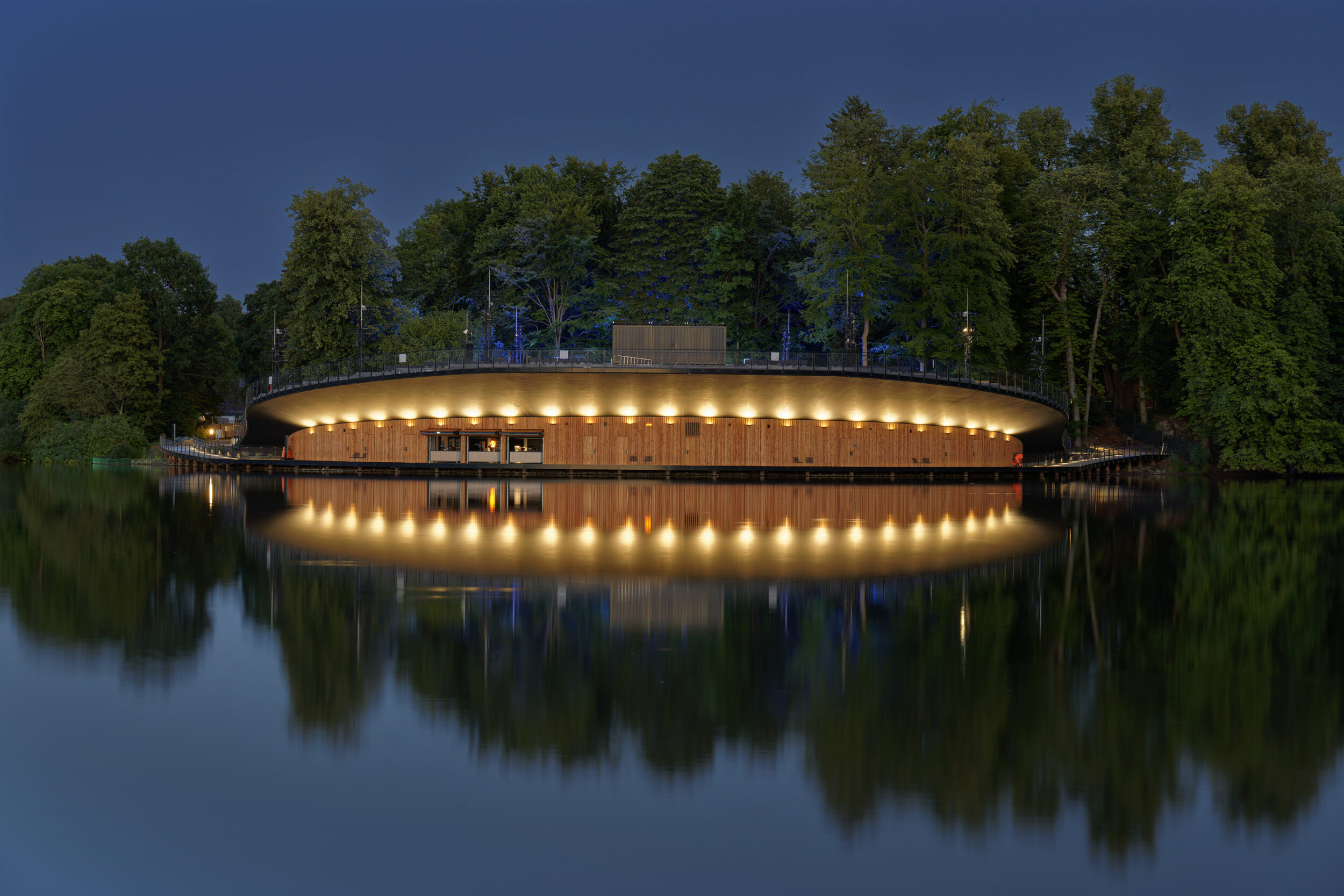 Hervorgegangen als 1. Platz aus dem Wettbewerb im Jahr 2020, war das Ziel des Entwurfs, einen Ort zu schaffen, der dem denkmalgeschützten Landschaftspark würdig ist und der angemessen auf die Gestaltung und Atmosphäre des Parks reagiert. Gleichzeitig galt es, die notwendigen Anforderungen an ein Tribünenbauwerk, inklusive der erforderlichen Nebenräume, behutsam in diese Gestaltung zu integrieren.